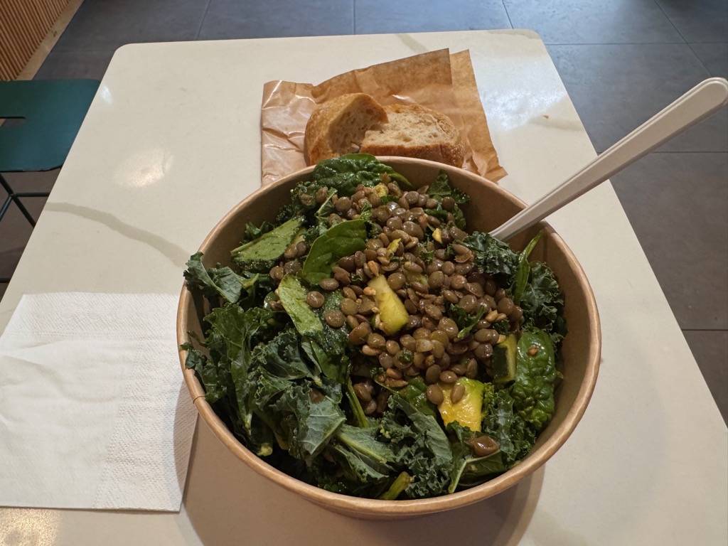 Bife’s Verde, Full Stop. Kale, baby spinach, avocado, warm lentils, sweet and sour cucumbers, fresh coriander, spicy sunflower seeds, sesame and ginger dressing. |